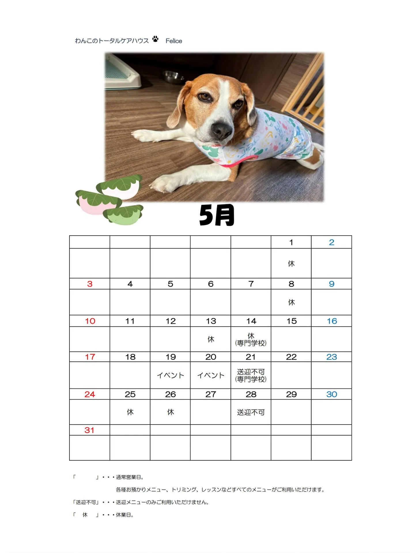 投稿遅くなりましたが 投稿遅くなりましたが5月の営業カレンダーです❣️5月25.26日は家族で出かけてしまうためお泊まりわんこの受け入れも不可の日となっております🐾ご不便おかけしますが、ご理解の程よろしくお願いいたします…